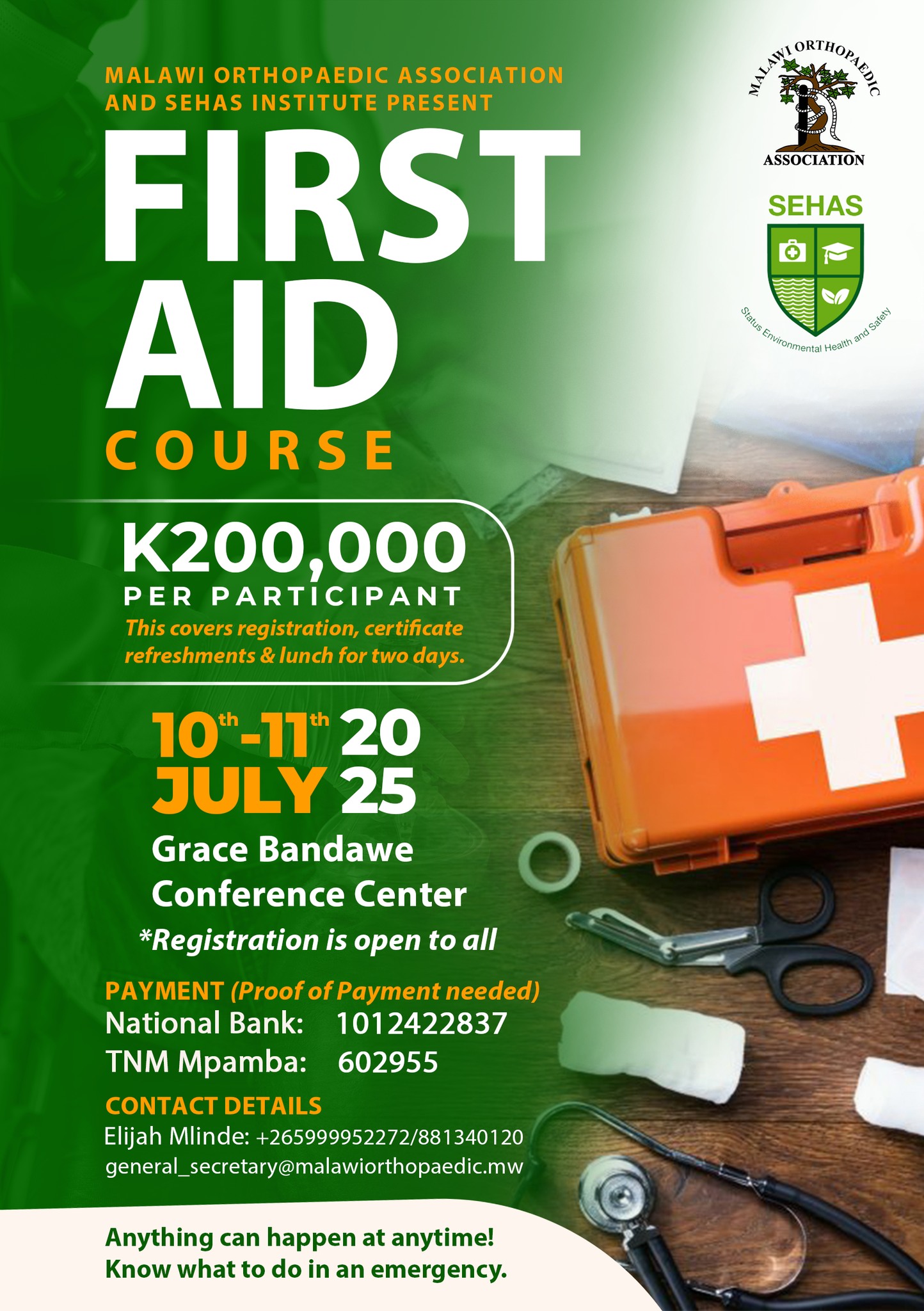 Do you know what to do in the event of an emergency? Do you have the necessary knowledge and skills to administer First Aid and save a life? This course will equip you with all that you need to know about First Aid. For more details see the poster or contact Elijah Mlinde on +265999952272/881340120,